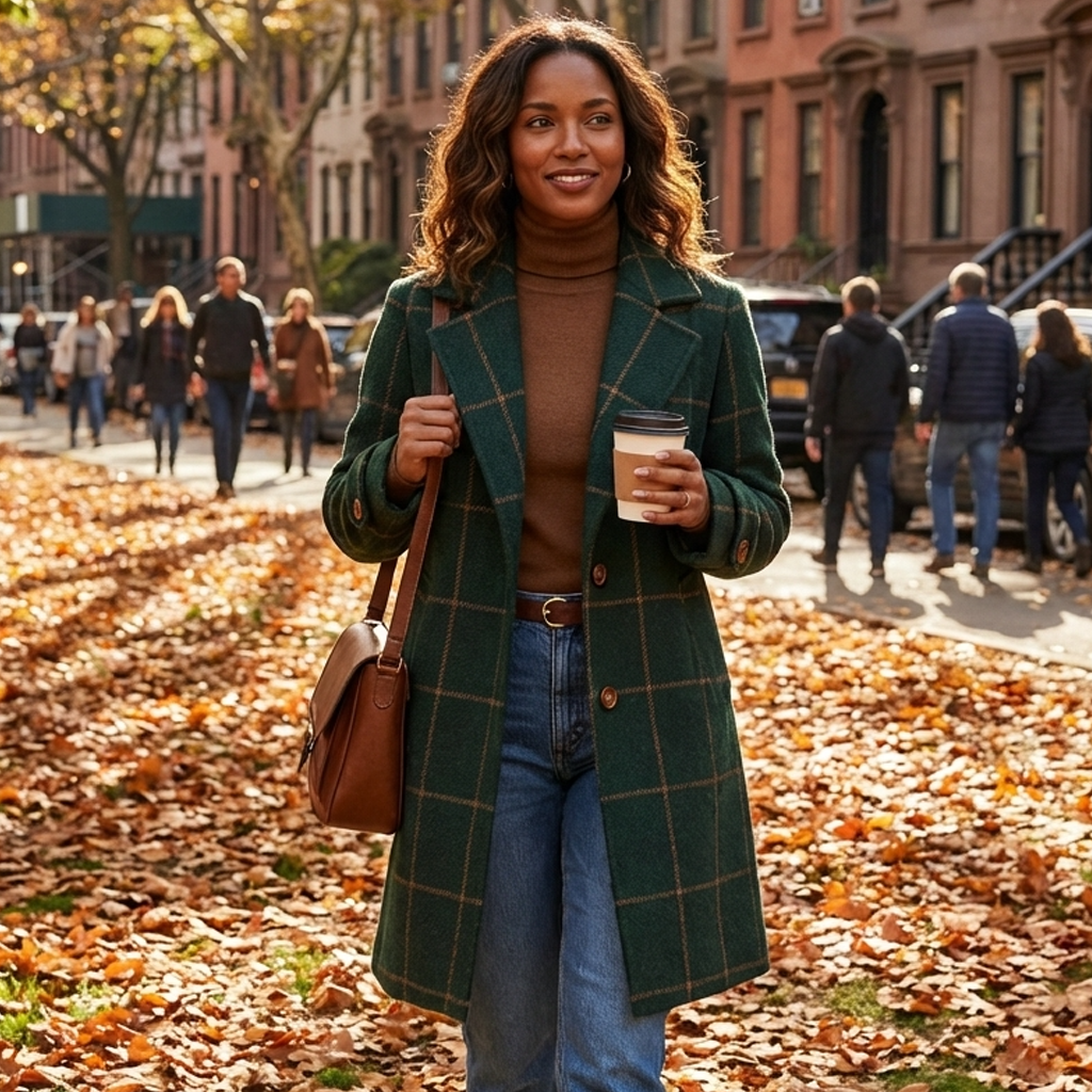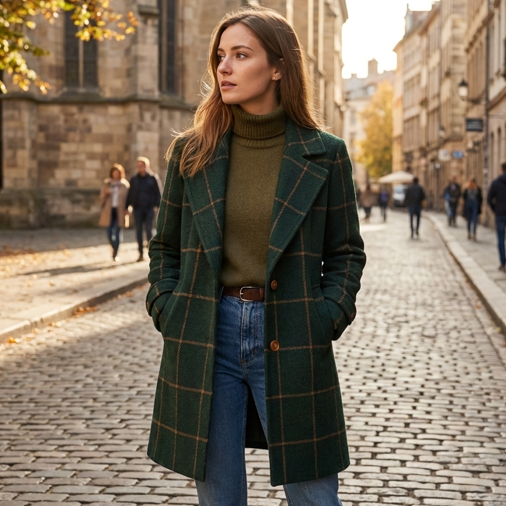 Le motif à carreaux discret et la coupe soignée mettent en valeur la silhouette, tandis que la longueur est pensée pour apporter plus de confort lors des journées plus fraîches.