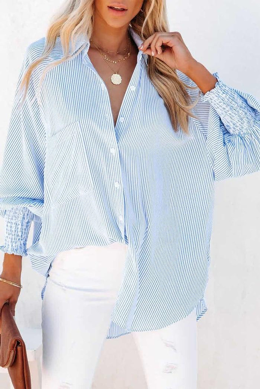 Élégance décontractée avec cette chemise à rayures pour femmes, dotée de poches pratiques, d'un col en V moderne et de manches longues smockées. Un incontournable de l'été, ce top tunique combine confort, style et originalité pour un look à la fois tendance et féminin.